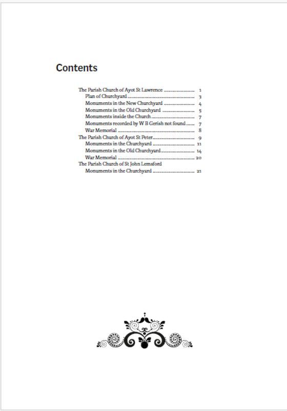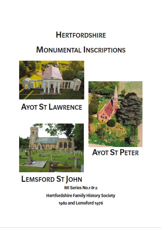 Hertfordshire Monumental Inscriptions Series Volumes 1 & 2 originally published in 1982 as two individual booklets, republished in 2005 as one booklet. Now out of print but available to download as a PDF file. 40 pages containing transcriptions made in 1981 of monumental inscriptions in the New Church and Old and New Churchyards of Ayot St Lawrence, the War Memorials of Ayot St Lawrence and Ayot St Peter, in the mid 1970s the New and Old Churchyards of Ayot St Peter and the Churchyard of St John, Lemsford. In addition introductions, plans for the Ayot St Lawrence Churchyards and a surname index are included.