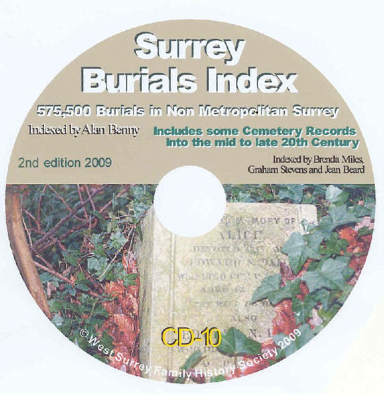 THE SURREY BURIAL INDEX, compiled by Alan Benny, includes 575,500 burials and covers the period from the start of each Parish Register, mostly up to 1865 (some later) for ALL ANCIENT parishes and many "modern" parishes (created after 1837) in RURAL SURREY. In addition to parish burials the index includes Dorking Cemetery records up to 1999, Godalming (Nightingale) Cemetery records up to 1998 and Godalming (Eashing) Cemetery records to 2003. Also, there are separate full transcription and indexes to Dorking Cemetery to 1950, Eashing to 1953 and Nightingale to 1955. Entries from more that 30 non-conformist Registers within the county.