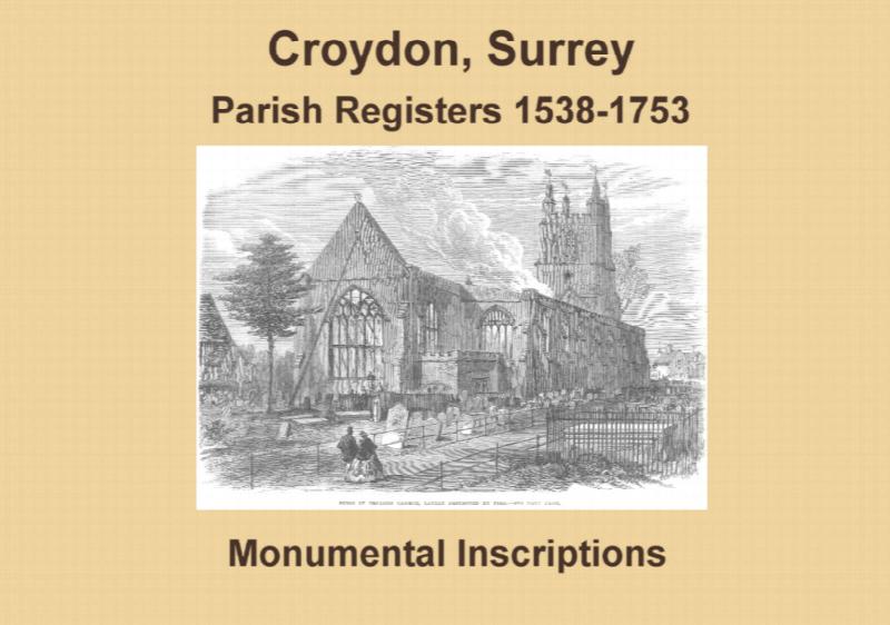 Parish registers of St. John the Baptist 1538-1753 indexed by Robert Mesley. Baptism, Marriage and Burials included. Monumental Inscriptions to 1882 for the following Burial Places: Croydon Cemetery; Christ Church; The Friends Burial Ground; Pump Rail Chapel; St. James's; St. John's; St. Peter's; St. Mary's Addington; St. Mary's Beddington and St. Stephen's Shirley - Indexed by Paul Charleton.