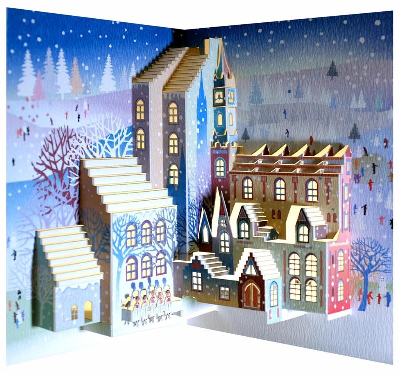 This festive Christmas card features a Snowy town scene with Carol Singers in the town square.