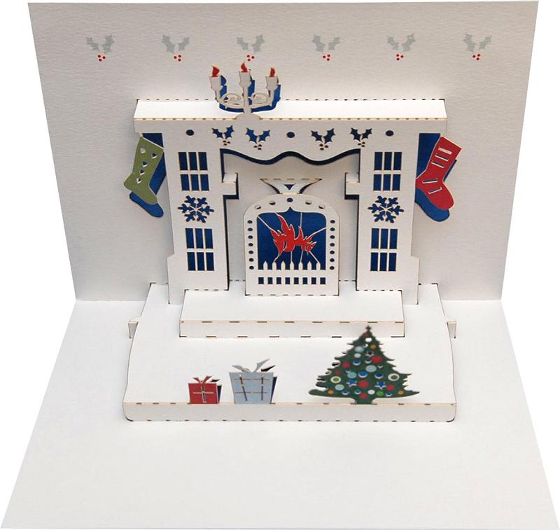 This festive Christmas card features a fireplace with a fire in the hearth, candles on the mantle and Christmas stockings hanging. It shows a Christmas tree and presents.