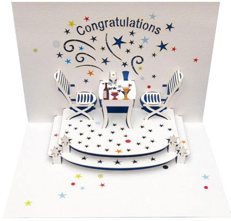This card features a table and chairs set for a congratulatory dinner for 2. Congratulations is written across the back like a banner, with multi-coloured stars decorating the card.