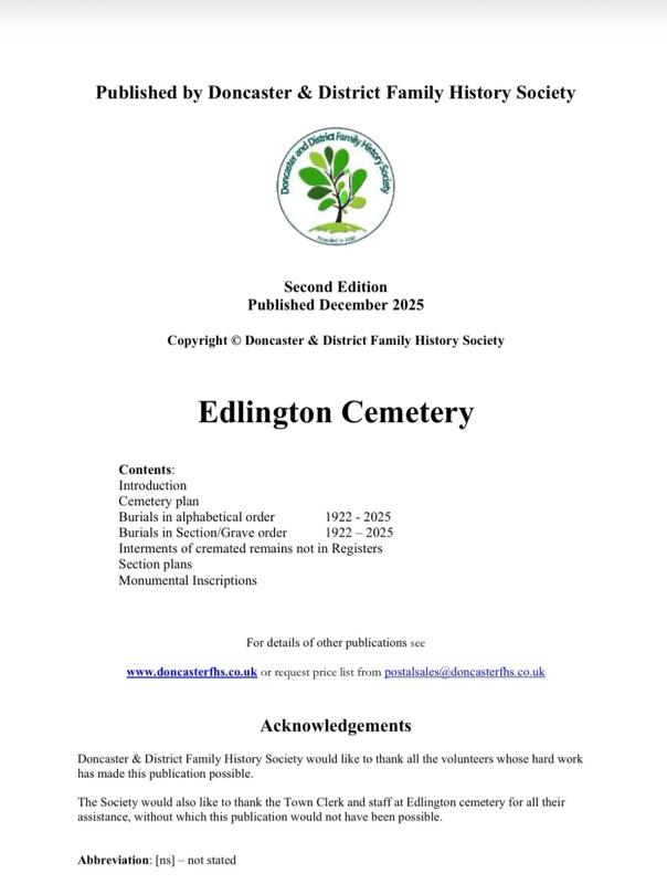 Edlington Cemetery Burials with Monumental Inscriptions 2nd edition 2025 Contents include Cemetery plan Burials in alphabetical order 1922-2025 Burials in Section/Grave/Plot order 1922-2025 Interment of cremated remains not in burial registers Section plans Monumental Inscriptions with grave and plot reference 1922-2008 Product Ref: DON-1154