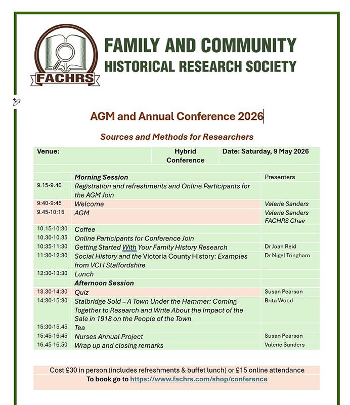 An online only ticket to the FACHRS 2026 Conference - Sources and Methods for Researchers being held on Saturday 9 May 2026 at Premier Inn, Trentham Gardens, Stoke on Trent.