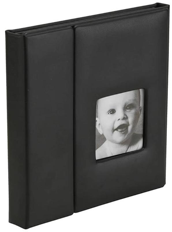 Finished in smooth black PU material, the folio features wrap-around covers with a secure magnetic closure to keep contents safely enclosed. The front cover includes a 2.5 × 2.5 inch window, allowing you to personalise the folio with a photo or title insert.