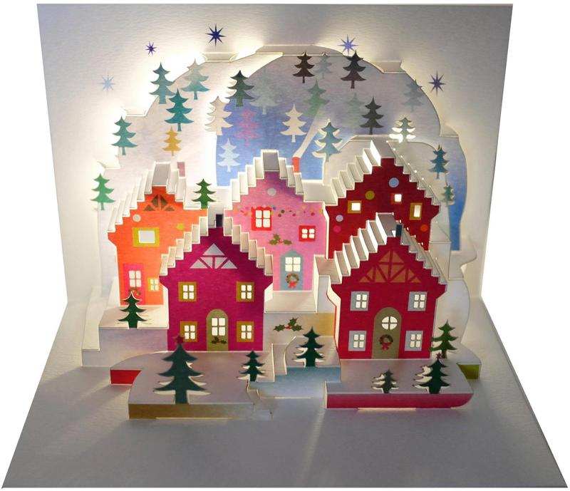 This festive Christmas card features a snowy town scene with colourful houses and trees on the hills behind.