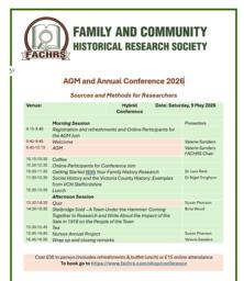 An online only ticket to the FACHRS 2026 Conference - Sources and Methods for Researchers being held on Saturday 9 May 2026 at Premier Inn, Trentham Gardens, Stoke on Trent. The ticket and all information about the Conference will be sent to the email address you provide when booking.